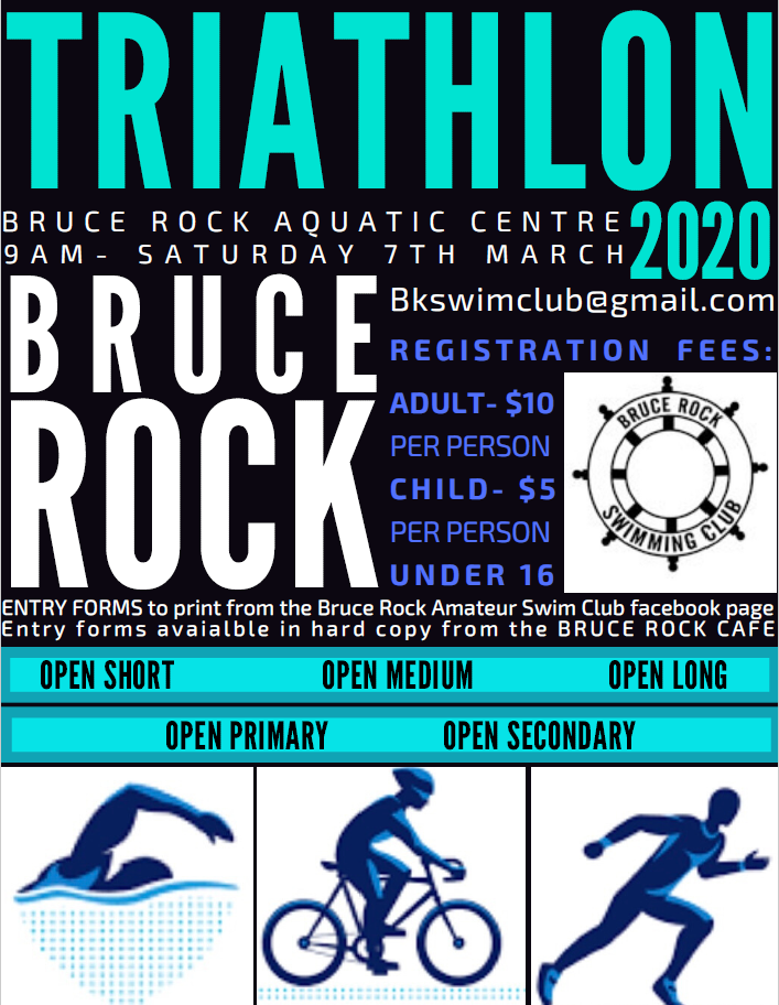 Compete Solo or as a Team in the Bruce Rock Triathlon at the Aquatic Centre! Individual Entry Form Available Here. Team Entry Form Available Here.