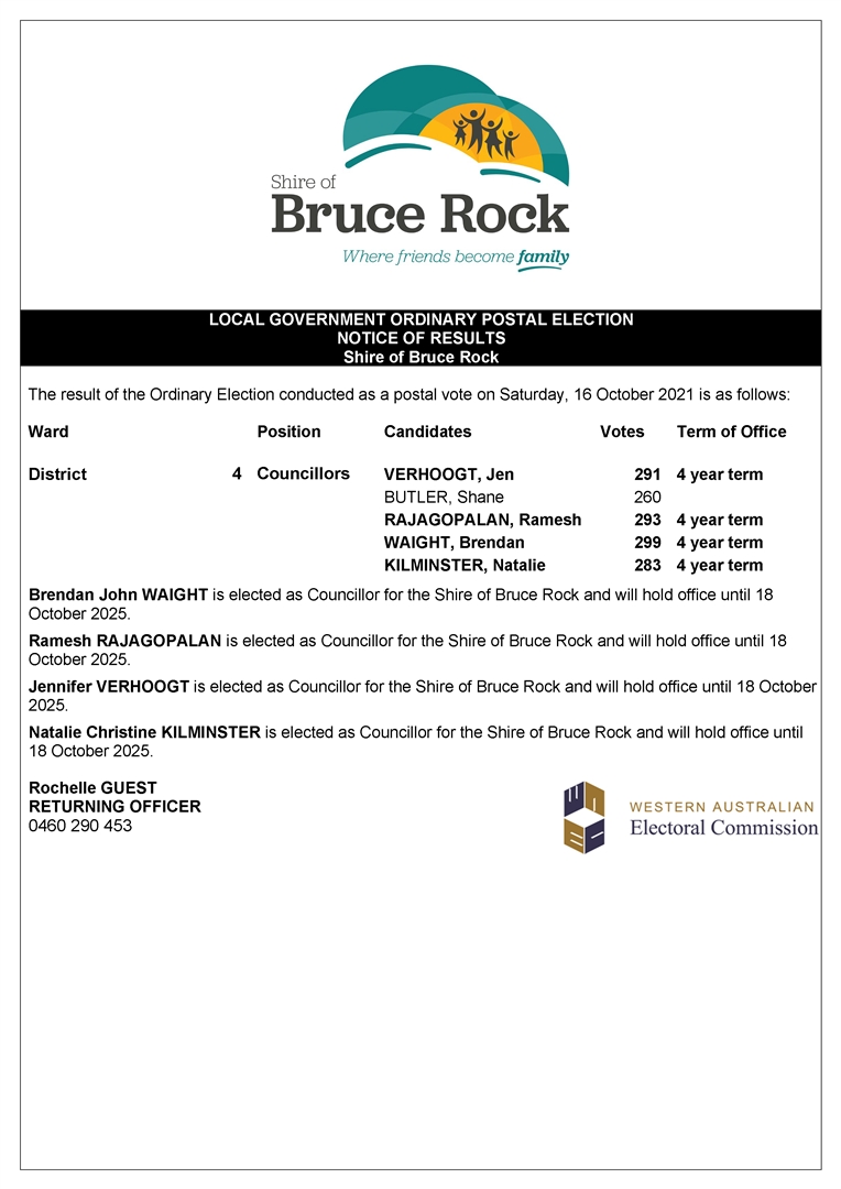 Shire of Bruce Rock Election Results Noticeboard ORDINARY