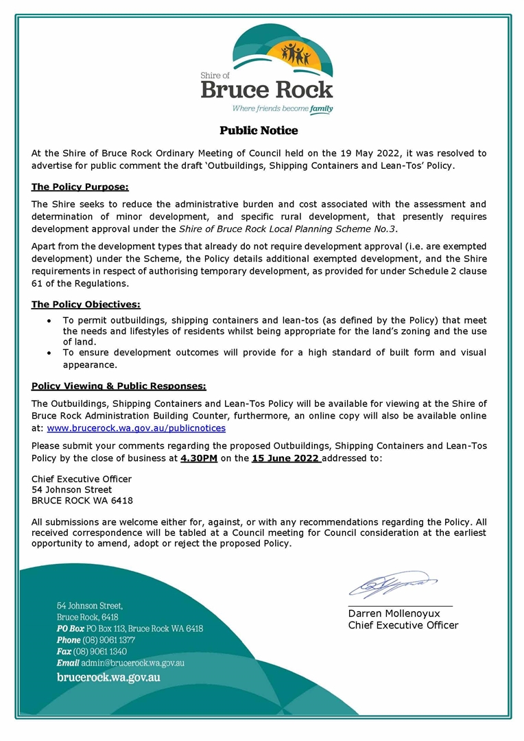 Shire of Bruce Rock Proposed Outbuildings-Sea Containers - Lean Tos Policy